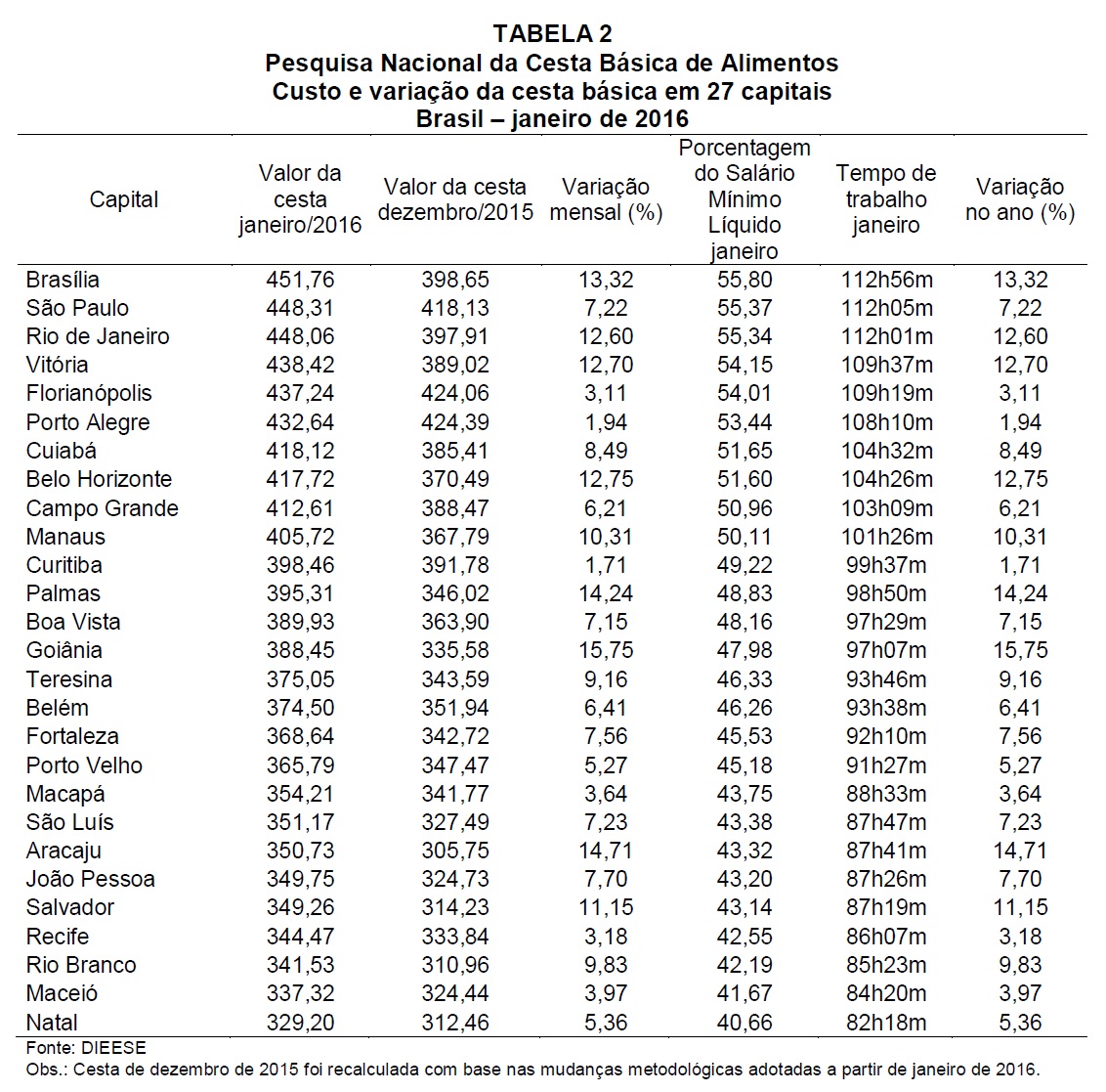 Em janeiro de 2016, houve aumento no preço do conjunto de bens alimentícios básicos em todas as capitais onde se realiza a Pesquisa Nacional da Cesta Básica de Alimentos. As maiores altas ocorreram em Goiânia (15,75%), Aracaju (14,71%), Palmas (14,24%) e Brasília (13,32%). O menor aumento foi registrado em Curitiba (1,71%).