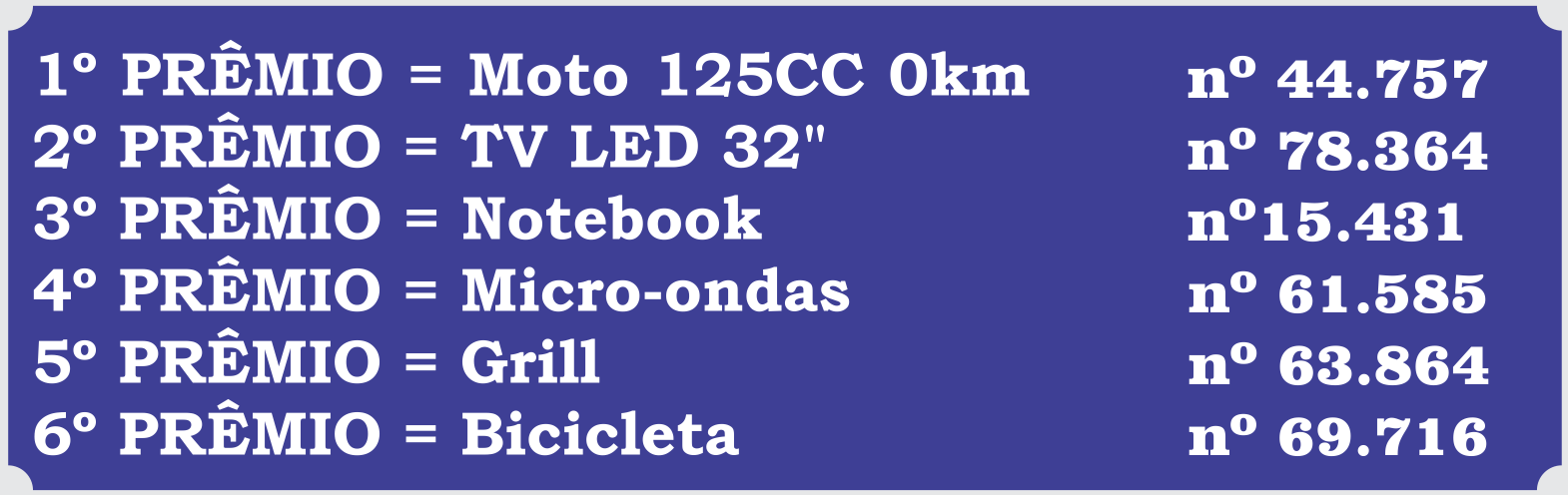 O Sindicato dos Metalúrgicos realizou no dia 19 de julho às 18h, quinta-feira, o sorteio público dos seis prêmios do Confederativo. Veja abaixo os números sorteados.
