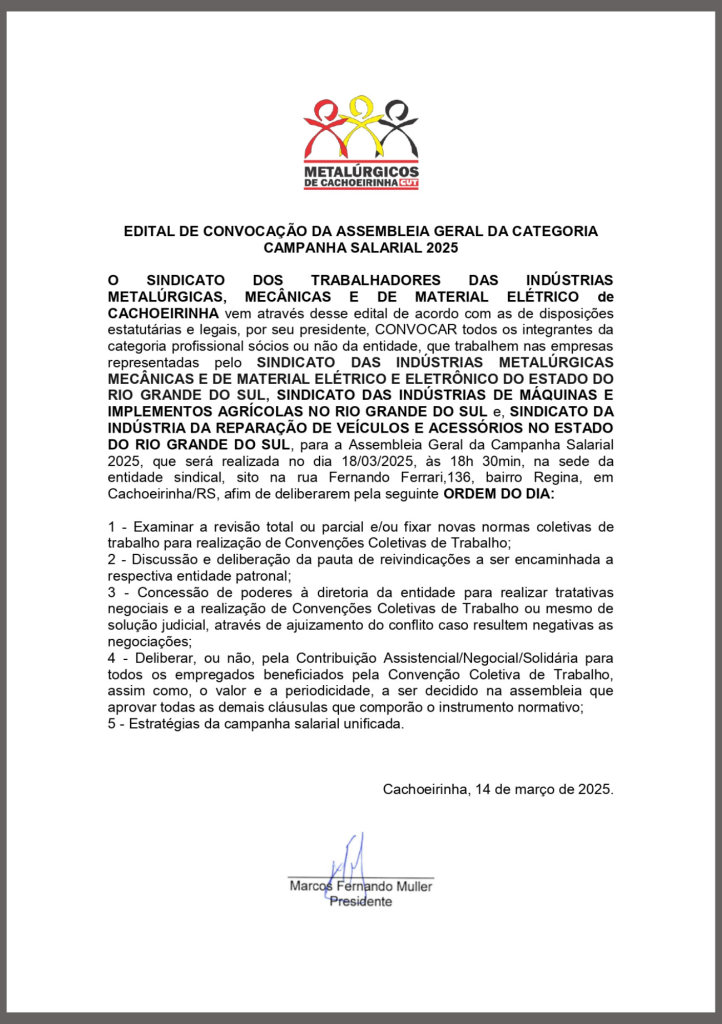 O Sindicato dos Metalúrgicos de Cachoeirinha (STIMECA) convoca toda a categoria para participar da Assembleia Geral da Campanha Salarial 2025, que será realizada no dia 18 de março, às 18h30, na sede do sindicato (Rua Fernando Ferrari, 136, bairro Regina, Cachoeirinha/RS). A assembleia é um momento decisivo para definir as reivindicações dos trabalhadores e as estratégias da campanha salarial unificada. Na pauta, estarão temas como a revisão das normas coletivas de trabalho, a elaboração da pauta de reivindicações e a autorização para negociações com os sindicatos patronais.